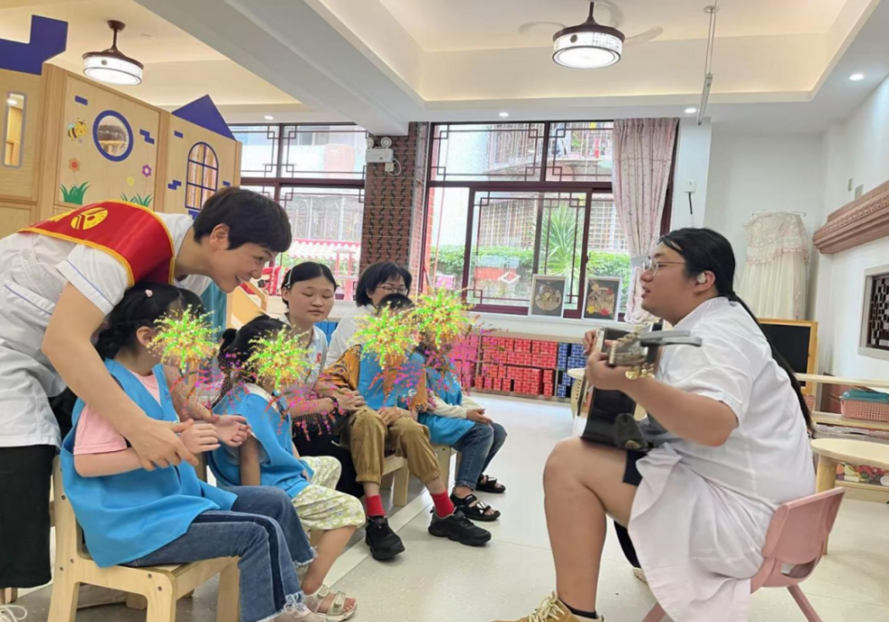 同时,音乐治疗师给残障儿童提供公益的团体音乐治疗,并在儿少科专家团队以及幼儿园老师的辅助下让儿童参与到音乐当中来,让孩子们通过聆听不同风格的音乐、观察乐器的演奏方式以及亲自触摸和操作乐器,全方位地感受音乐的魅力。