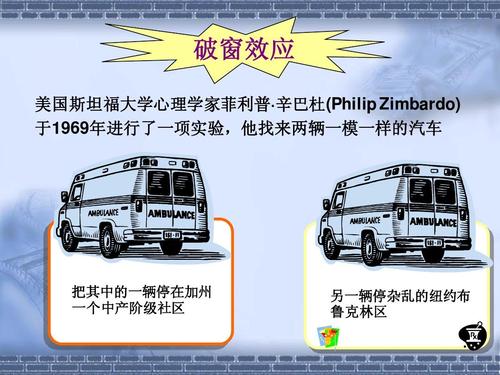 1969年,美国斯坦福大学的心理学家詹巴斗把两辆相同的小汽车分别放在两个地方,一辆放在帕罗阿尔托的中产阶级小区,第二辆放在脏乱的布朗克斯街区,并取走了第二辆汽车的车牌。结果,第一辆车停了很长时间也“无人问律”,而第二辆车不到一天就被伤了。詹巴斗又用锤子把第一辆车的车窗敲了个大洞。这次,几个小时之后,第一辆车也不冀而飞。