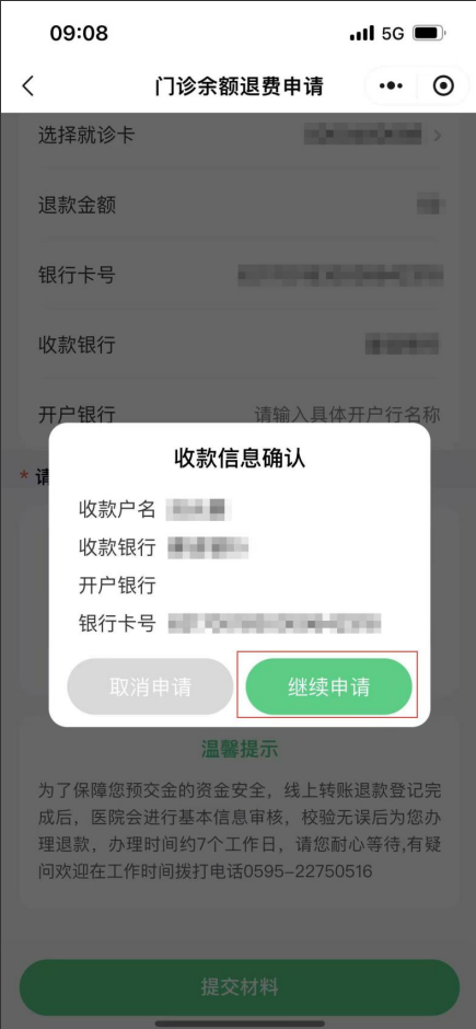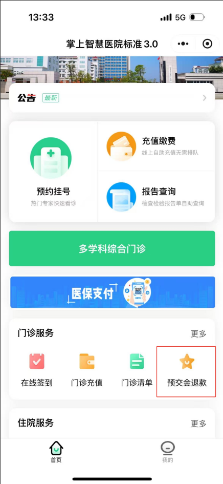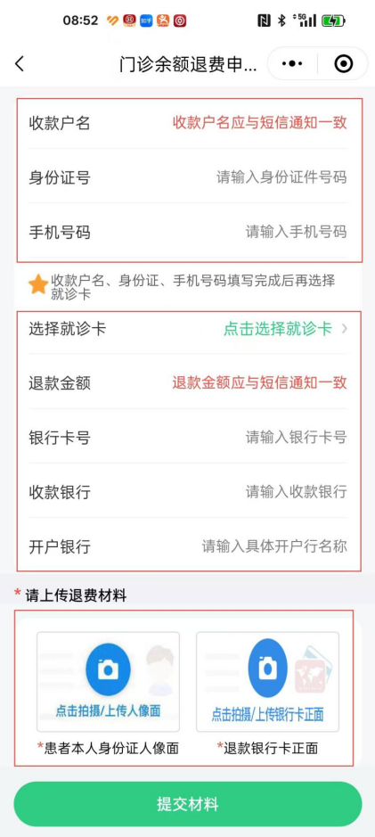也可以从小程序乐竞体育“预交金退款”进入,根据如下操作引导进入门诊退费小程序申请线上退款。线上现金退款需绑定与就诊卡对应姓名的银行卡。