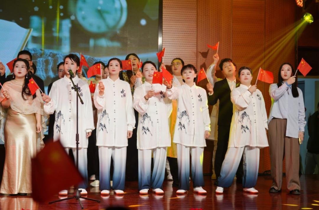 晚会现场红旗飘扬,温馨而热烈。台上演员倾情演绎,台下观众掌声雷动,闪光灯与欢呼声交织成一片欢乐的海洋。